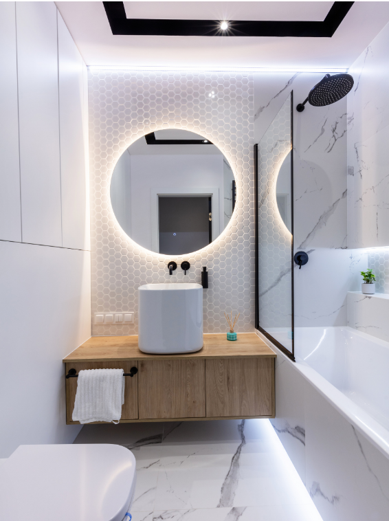 Nhiều ánh sáng cho phòng tắm sẽ giúp không gian thông thoáng hơn. Đừng quên lắp thêm đèn bên cạnh bồn rửa, khu vực gương và vòi hoa sen hoặc bồn tắm.