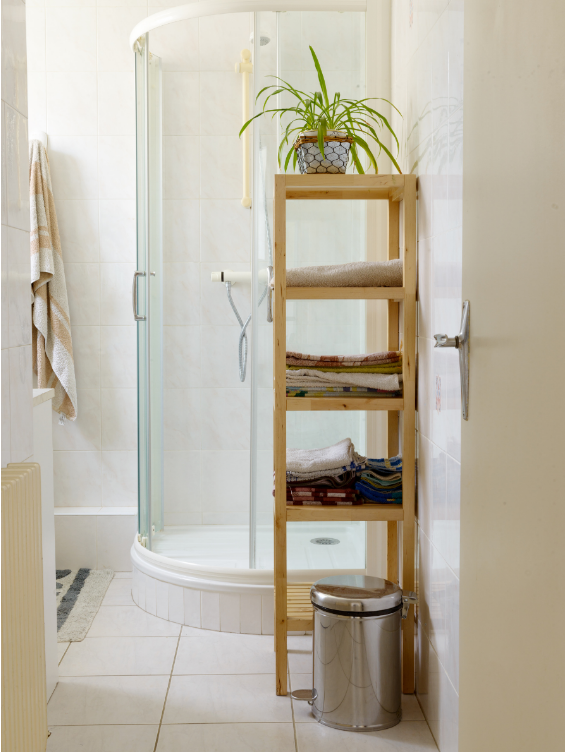 Giá và kệ dọc là ựa chọn tuyệt vời cho phòng tắm nhỏ, để cất khăn tắm, vật dụng làm sạch và thậm chí đặt đồ trang trí, tạo phong cách riêng cho không gian phòng tắm.