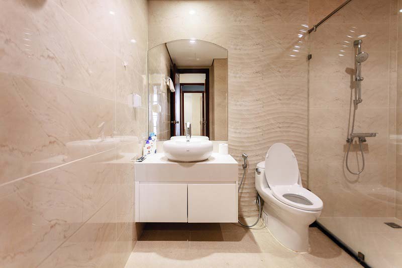 Phòng tắm thường xuyên tiếp xúc với nước, nên bạn chọn gạch lát nền màu sáng, bề mặt nhám, chống trơn, chống thấm hoặc chống ẩm mốc rất dễ vệ sinh lau chùi. Thiết bị vệ sinh nên chọn sản phẩm tráng sứ cao cấp, chống bám bẩn, ngăn ngừa vi khuẩn, mảng bám.