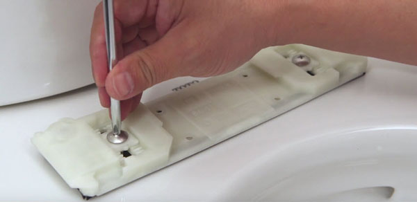 Bước 1: Gắn bảng đế vào thân bồn cầu và dùng tô vít cố định tạm thời ( lưu ý không vặn chặt).