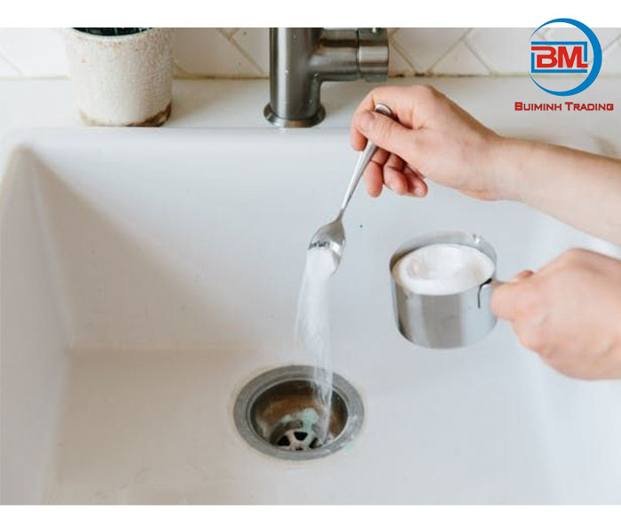 - Đổ baking soda vào ống thoát bằng qua miệng cống