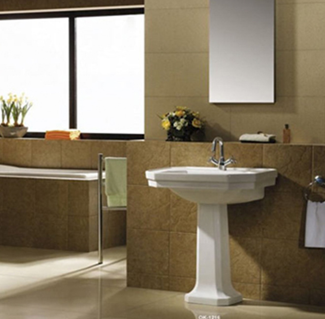 Chiếc chậu rửa chân dài, phần chậu cũng được gắn trên tường và lắp đặt thêm chiếc chân dài nối từ phần dưới của chậu đến mặt sàn.