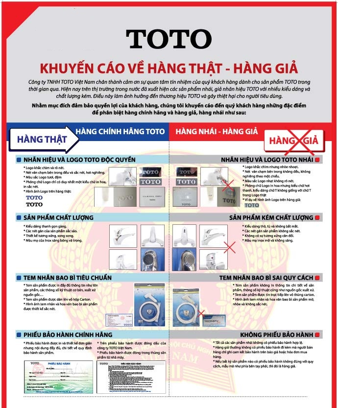 - Bệt ToTo hàng thật: phiếu bảo hàng được làm đơn giản không hoa văn màu mè, nhưng trong đó ghi đầy đủ và chính xác những thông tin theo quy định pháp luật. Có đóng dấu đỏ của công ty.